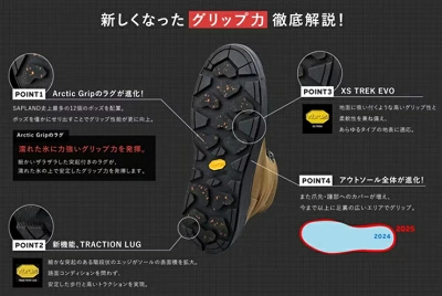 ビブラムアークティックグリップの滑り止め部分のグリップポッツが10個から12個に増えました。少しだけせり出たせることでグリップ力がアップ。階段状のエッジがかかとの表面積を広げ、安定した歩行と高いトラクションを実現しています。地面に吸い付くような高いグリップ性と柔軟性を兼ね備えてあらゆる路面に対応するXS TREK EVOを搭載。足裏全体でグリップできるようにアウトソールのつま先、踵部分が広くなりました。※ユニセックスタイプのみ